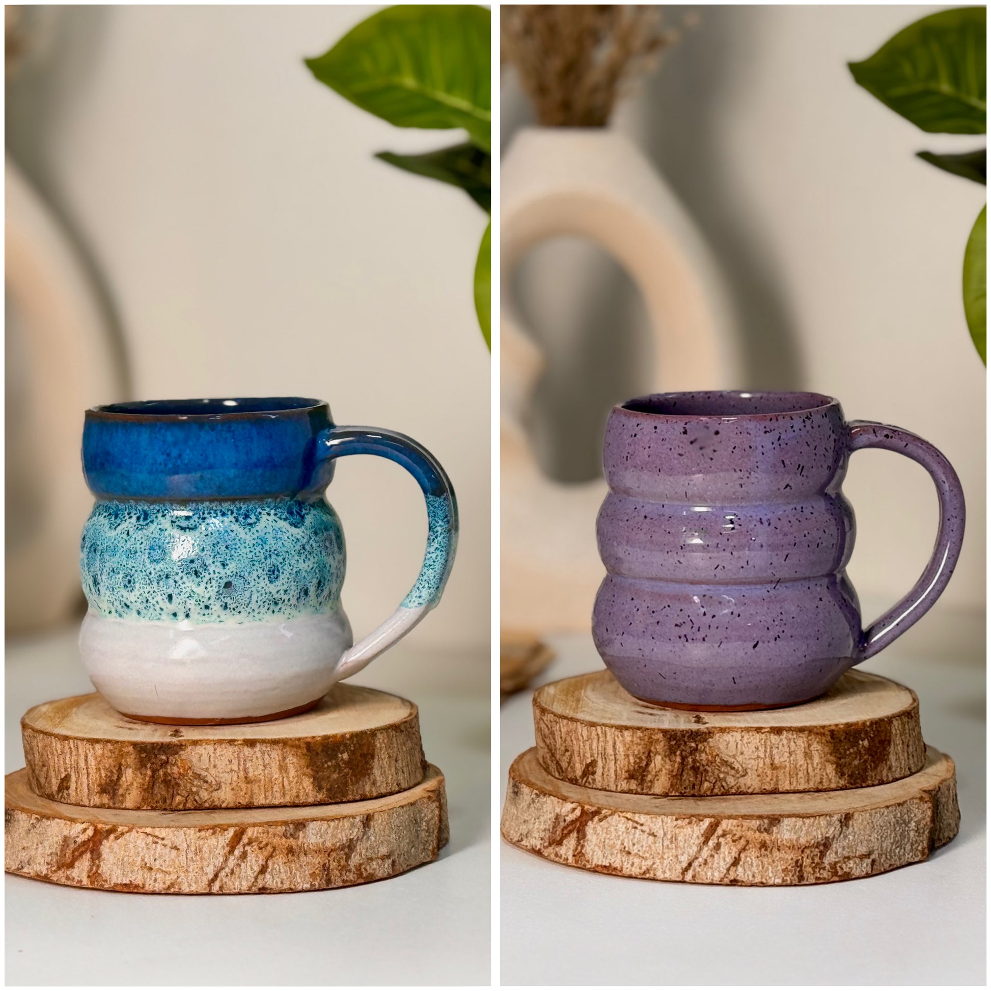 Two handcrafted pottery mugs (320 ml each), designed with playful curves and dreamy colors. Microwave safe & dishwasher safe — made to bring joy to your daily coffee moments. ✨