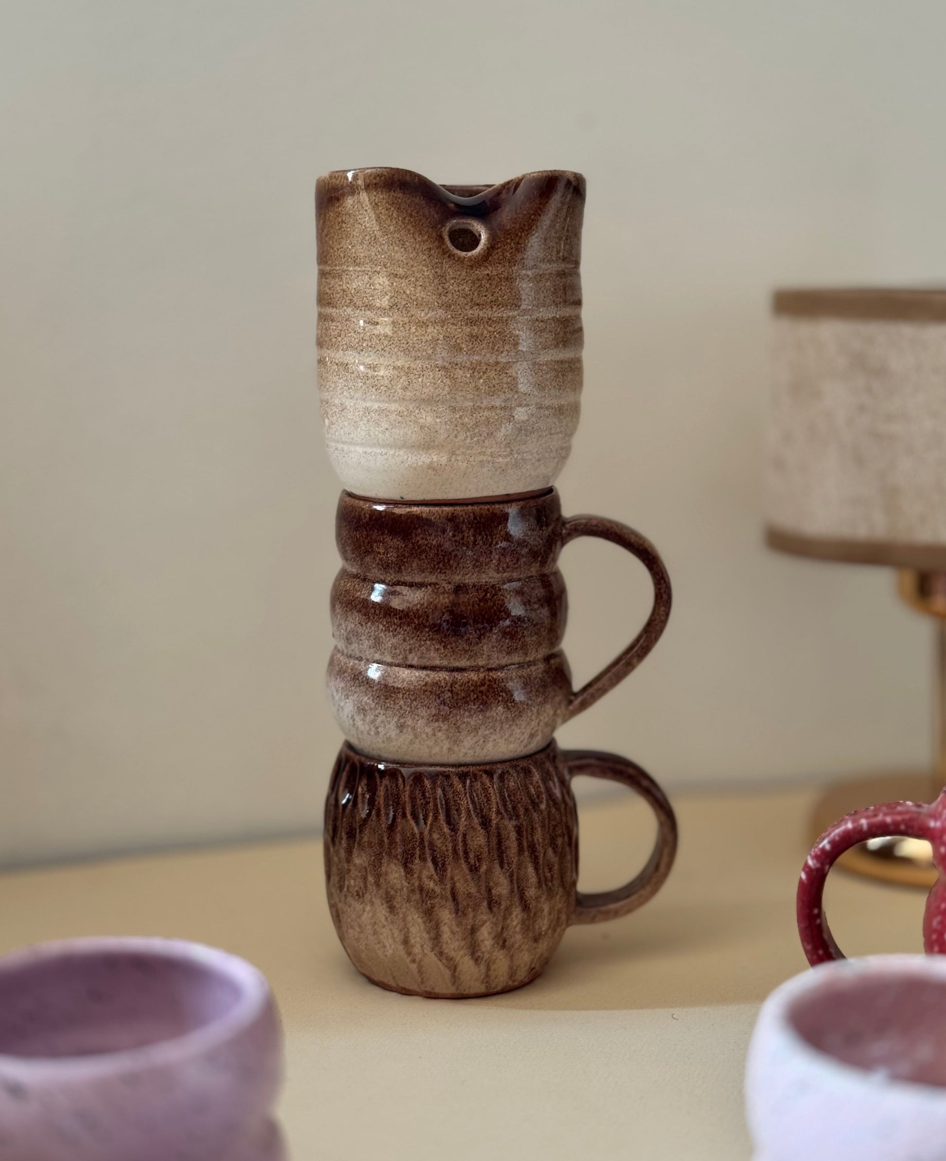 A cozy trio of handmade pottery mugs in warm brown tones — crafted to bring comfort and calm to your winter days. Each mug has its own unique texture and design, yet together they create the perfect earthy harmony. Ideal for coffee, cocoa, or tea on chilly mornings.