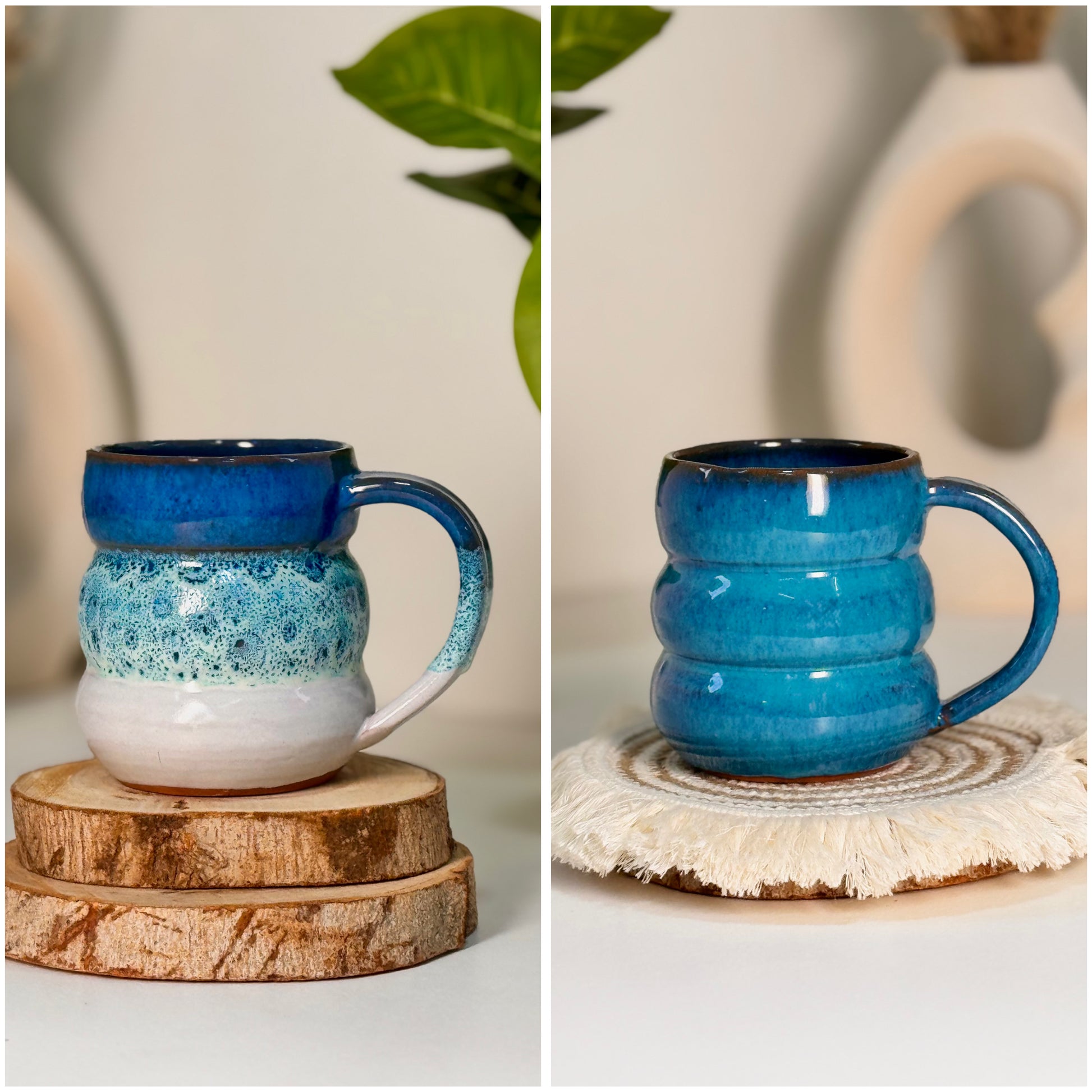 This handmade pottery duo blends deep ocean blues with soft, frothy whites — like waves meeting the shore.
